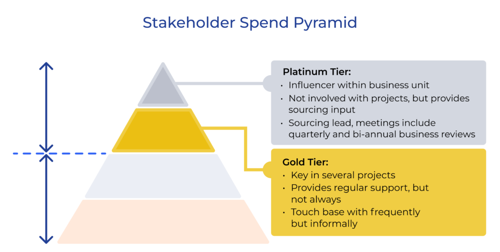 From there, you can begin to prioritize your most critical internal stakeholders. Natoff suggests tiering stakeholders similar to how you rank suppliers in a spend pyramid. When prioritizing, it’s crucial to consider your stakeholders’ needs, impact, and alignment with your organization’s goals.