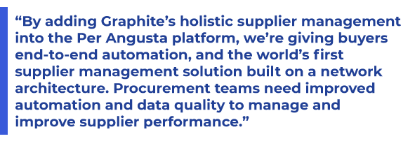 “By adding Graphite’s holistic supplier management into the Per Angusta platform, we’re giving buyers end-to-end automation, and the world’s first supplier management solution built on a network architecture. Procurement teams need improved automation and data quality to manage and improve supplier performance,” said Pierre Laprée, Per Angusta CEO. “We are thrilled to incorporate Graphite’s market-leading supplier management as part of our intuitive platform built for buyers, by buyers.”
