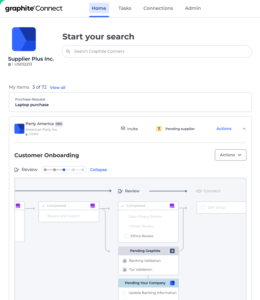 Traditional supplier onboarding can take weeks of back-and-forth communication, redundant data entry, and manual validation. Graphite Connect eliminates this inefficiency with supplier-managed profiles. Once a supplier completes their profile, they can share it with multiple buyers instantly—with just one click. No more repetitive form-filling or duplicate submissions.