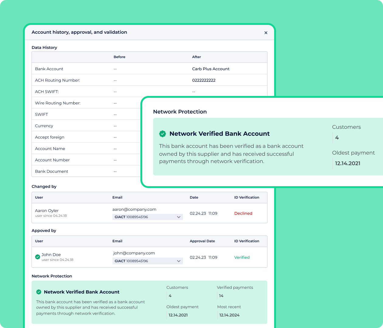 Changes to critical supplier data require authorization from two profile administrators, adding an extra layer of security. This supplier validation process helps prevent fraud and ensures that all data updates are legitimate and trustworthy.