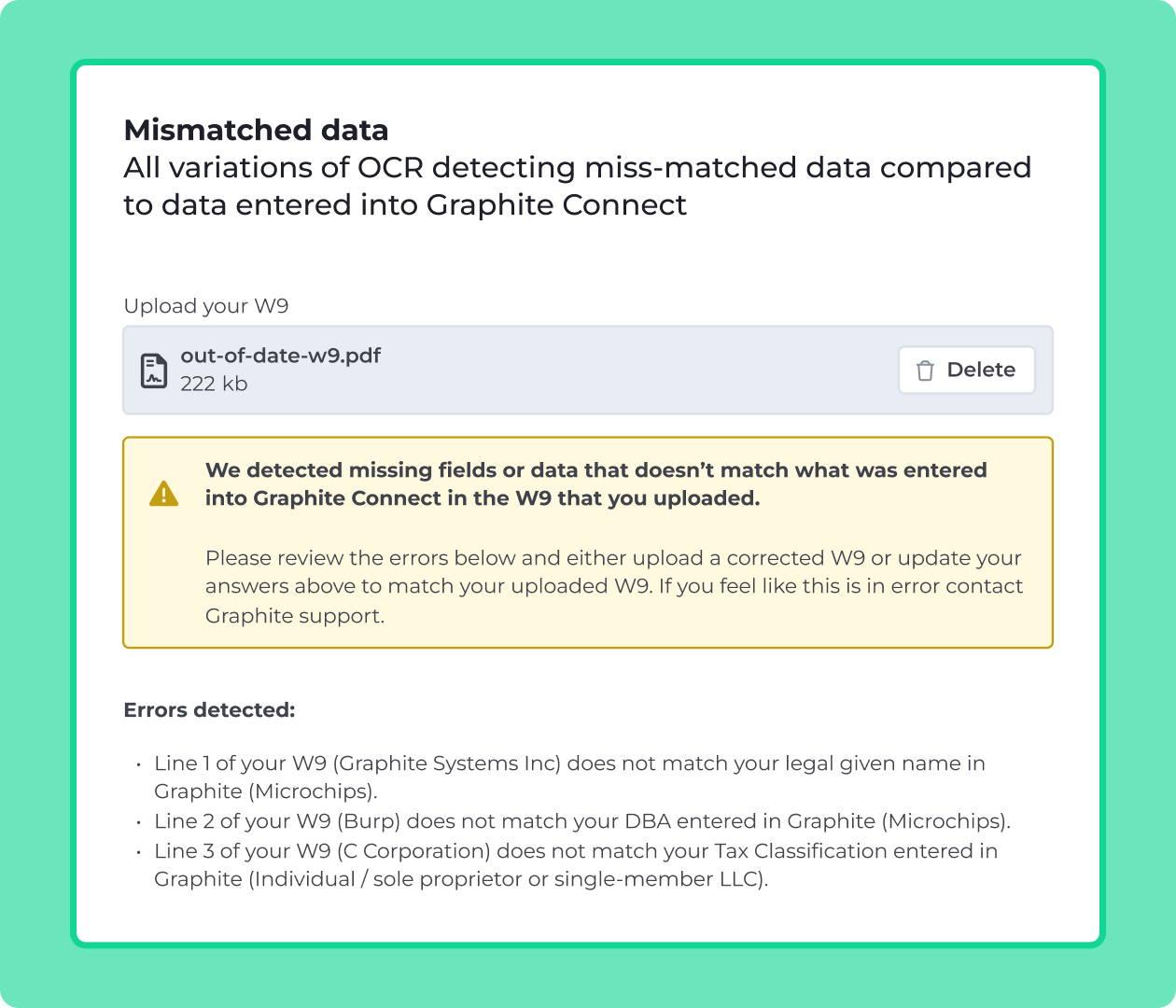 Graphite Connect’s vendor data validation system ensures that third-party supplier information is accurate and up-to-date. By automating the verification process, your team can avoid the errors and inconsistencies that come with manual data entry.